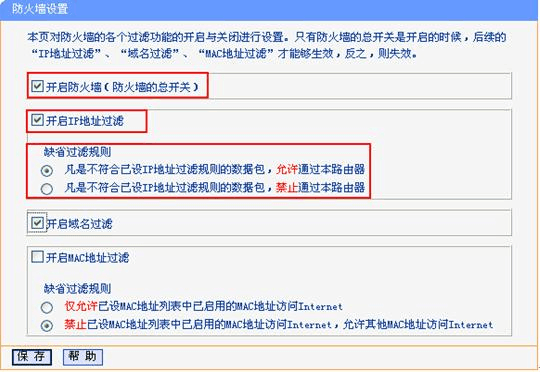 注意這里選擇的缺省過(guò)濾規(guī)則是:凡是不符合已設(shè)IP 地址過(guò)濾規(guī)則的數(shù)據(jù)包,允許通過(guò)本路由器。