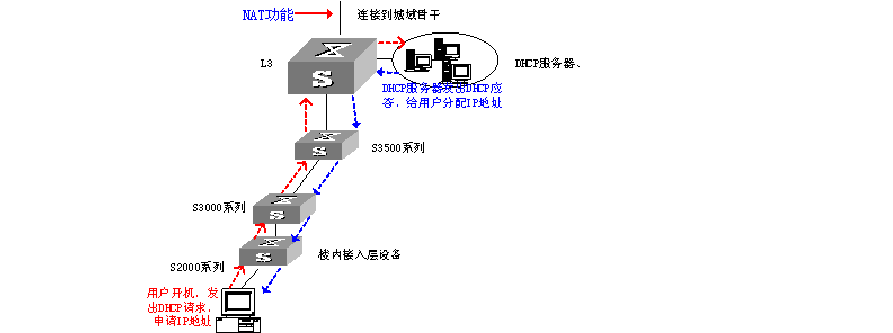 用戶計算機開機后會通過DHCP 報文申請IP 地址。接入層交換機、匯聚層交換機會將此請求報文轉(zhuǎn)發(fā)給DHCP 服務器。DHCP 服務器通過應答報文給用戶PC 分配IP 地址。有了IP 地址后,用戶就可以上網(wǎng)了。