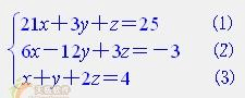 EQ blc{(a a lco2(21x 3y z=25, ⑴,6x-12y 3z=-3 , ⑵,x y 2z=4 , ⑶))