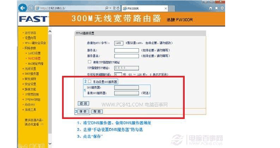 4、那么該如何操作呢?放大很簡(jiǎn)單,我們只需將下面的DNS 服務(wù)器與備用DNS 服務(wù)器地址改成正常的,當(dāng)然你也可以將其去掉,然后將“手動(dòng)設(shè)置DNS 服務(wù)器”前面的勾去掉,然后點(diǎn)擊下方的保存即可,如下圖: