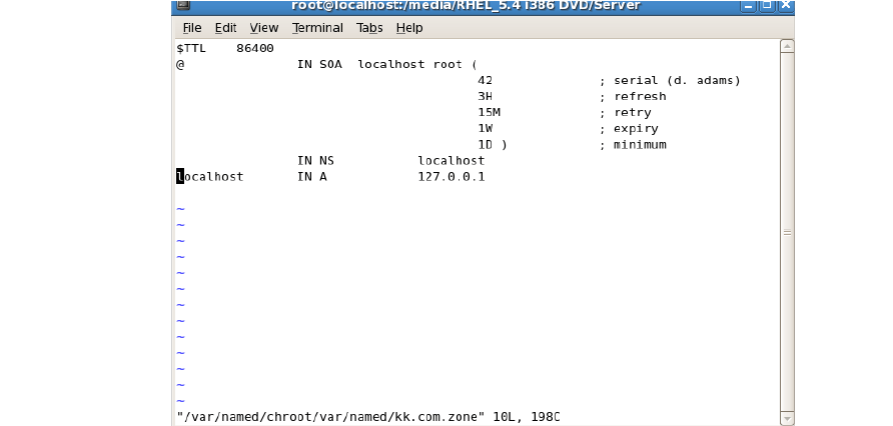,(3)配置DNS DNS 有兩個(gè)配置文件: ①主配置文件: /var/named/chroot/etc/named.conf 用來(lái)設(shè)置DNS 全局命令的 編輯DNS 主配置文件(默認(rèn)是空的)如下: 命令:vi /var/named/chroot/etc/named.conf 這里以kk.com 域名為例進(jìn)行配置,如圖: