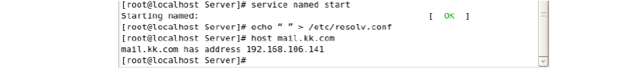 出現(xiàn)如圖11中mail.kk.com has address 192.168.106.141所示的內(nèi)容,說明DNS 服務(wù)配置成功。