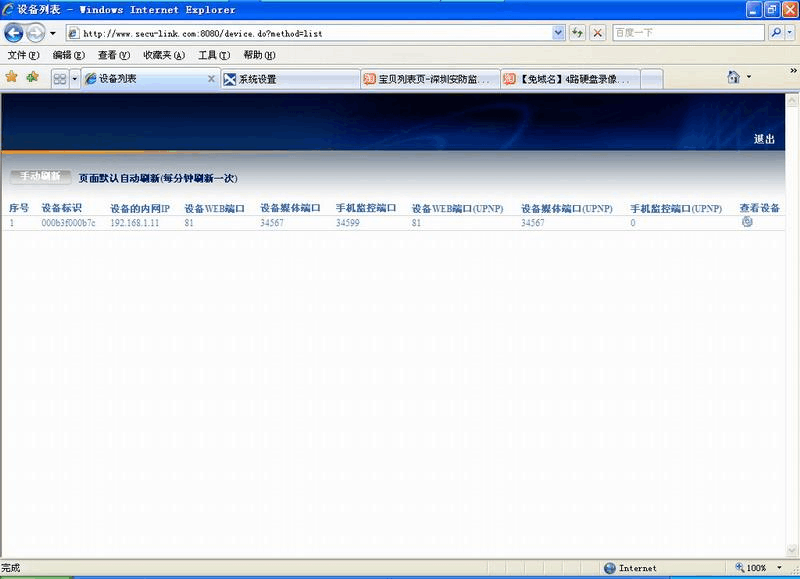 六、登錄進入后,就可以看到你當前的DVR ,如果配置正確,就會像下面的顯示方式列出來注(設備WEB 端口UPNP 和設備媒體端口UPNP ,一定要和前面的:設備WEB 端口和設備媒體端口本機一致,這樣才是正確的) ,然后點下面的查看設備,即可出現(xiàn)錄像機的登錄界面,這樣遠程就做好了!