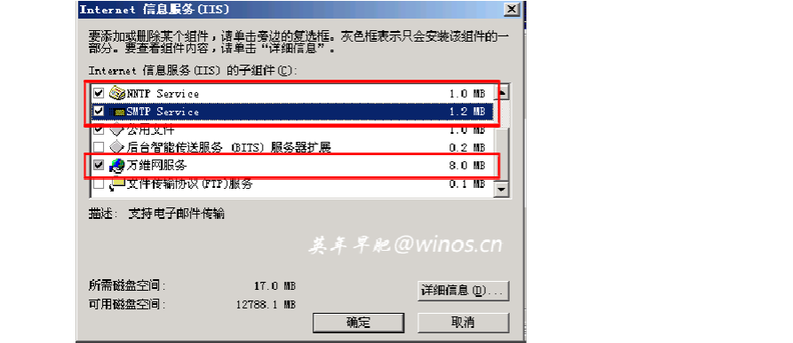3) 在“Internet信息服務(wù)(IIS )”中,選中“NNTP Service”、 “SMTP Service”和“萬維網(wǎng)服務(wù)”所對應(yīng)的復(fù)選框,再單擊“確定”。