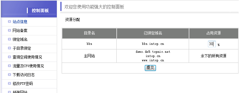 五、請(qǐng)您根據(jù)空間所開設(shè)網(wǎng)站的訪問(wèn)情況合理分配資源,在“占用資源”欄目填寫該子目錄所占空間資源的百分比,然后點(diǎn)擊“提交”完成操作。