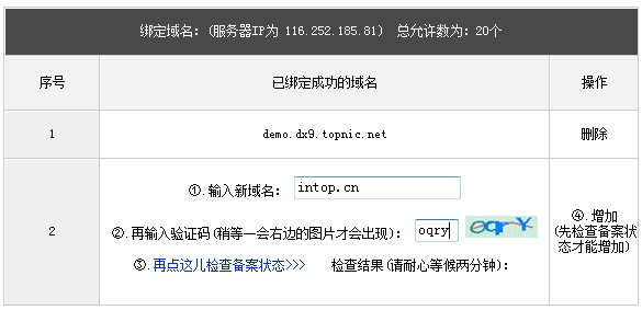 六、當(dāng)您的域名的備案信息錄入到系統(tǒng)的本地備案數(shù)據(jù)庫(kù)后,今后您添加該域名的二、三級(jí)或任意級(jí)的域名都不需要再查詢備案,可以直接增加域名綁定。請(qǐng)您在“①. 輸入新域名”欄目填寫要綁定的域名,然后直接點(diǎn)擊“增加”完成域名的綁定操作。