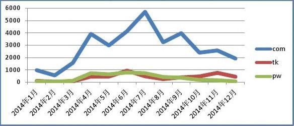 ? 2014年全球中文釣魚(yú)網(wǎng)站使用最多的前三位頂級(jí)域?yàn)椋?COM 、.TK 、.PW ,占全年