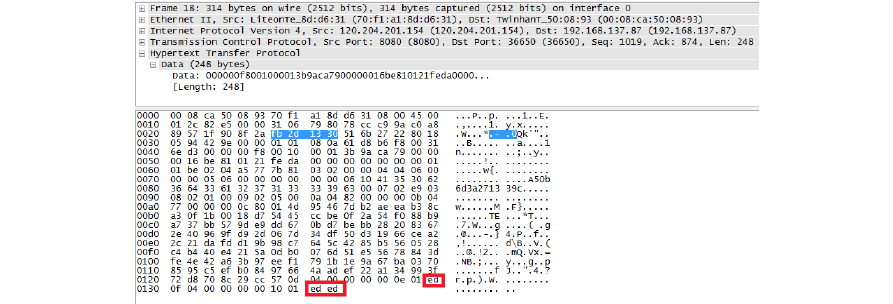 第18包是HTTP 數(shù)據(jù)包,它的大小為314字節(jié),其中有用數(shù)據(jù)長(zhǎng)度為248字節(jié),數(shù)據(jù)最后一行為空行,表明數(shù)據(jù)已經(jīng)傳送完畢,如下圖所示: