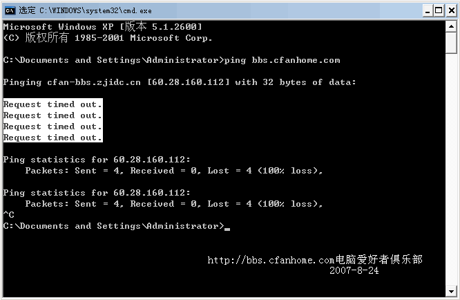 如果你“ping bbs.cfanhome.com”得到如下圖的請(qǐng)求失敗結(jié)果。
