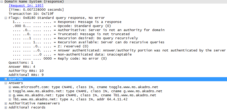 ,如圖所示,該包為響應(yīng)報(bào)文,格式與查詢報(bào)文類似。但Type 類型為CNAME ,說明規(guī)范主機(jī)名為toggle.www.ms.akadns.net