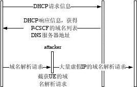 常見的DOS攻擊通常采用IP欺騙等方式向服務器發(fā)送大量的無用數(shù)據(jù)包。SA建立之后,IMS能夠杜絕IP地址欺騙。但是UE在發(fā)送(11)REGISTER消息之前,沒有對所傳送的消息進行任何保護。所以在注冊流程的第一個往返過程中可能發(fā)生DOS攻擊。因為3GPP/3GPP2沒有對如何防止DOS對DNS的攻擊作相關定義,所以可以在P-CSCF發(fā)現(xiàn)流程中對DNS發(fā)起DOS攻擊。設計攻擊流程如圖3。