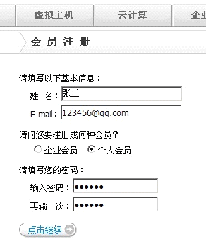 (姓名、E-mail, 請(qǐng)?zhí)顚憅q 郵箱,用純數(shù)字形式如57414921@qq.com, 不要用qq 別名郵箱!選擇注冊(cè)“個(gè)人會(huì)員”——輸入密碼?。?,點(diǎn)擊繼續(xù)!