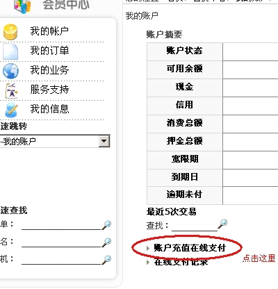 登錄后臺(tái)!點(diǎn)擊我的賬戶,選擇下面有個(gè)“賬戶充值在線支付”,輸入你要支付的金額!點(diǎn)擊繼續(xù)—完成支付!