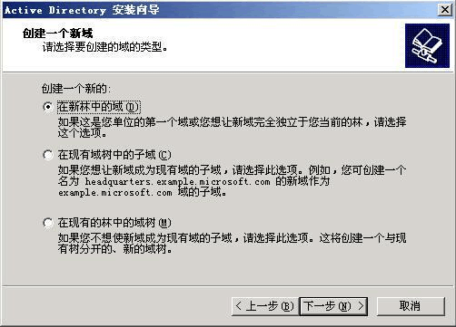 在這里由于這是第一臺域控制器,所以選擇第一項:“新域的域控制器”,然后點“下一步”: