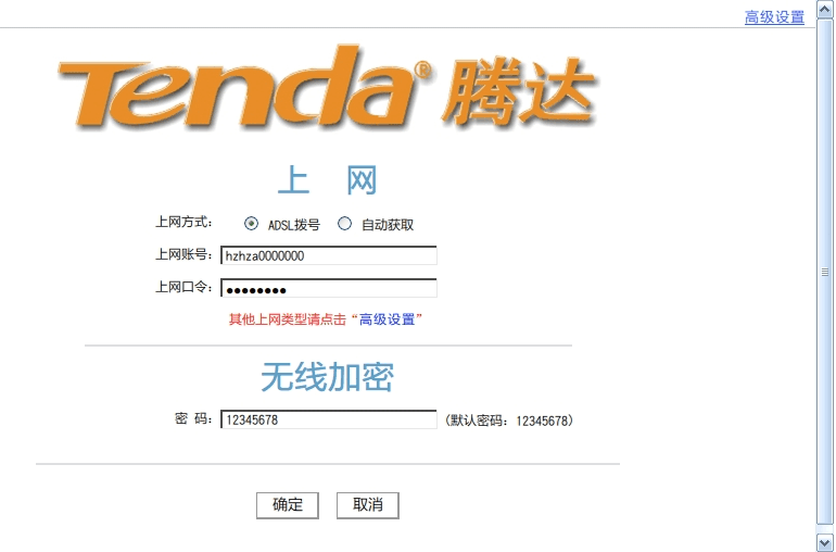 登錄成功后提示輸入上網(wǎng)帳號(hào)和密碼,如果已經(jīng)配置過(guò)了,不需要進(jìn)入,直接點(diǎn)擊右上角的【高級(jí)設(shè)置】,進(jìn)入配置界面,如下圖: