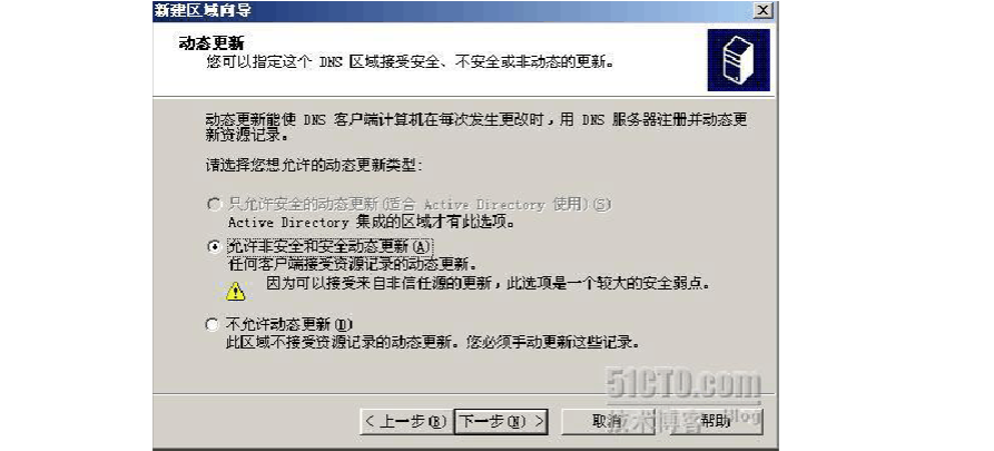 注意,區(qū)域必須允許動態(tài)更新,因為在創(chuàng)建AD 的過程中需要向這個區(qū)域?qū)懭階 ,Cname 和SRV 記錄。