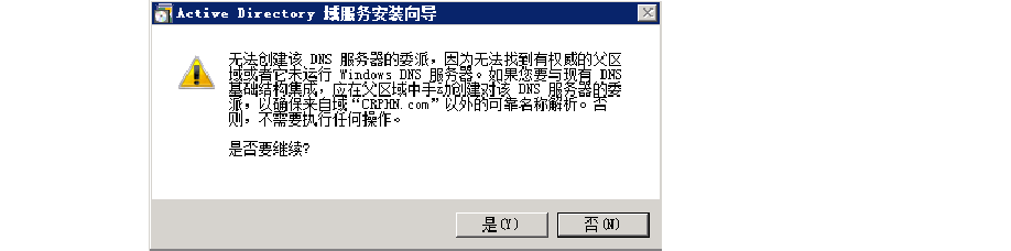 由于這是新林中的第一個(gè)域的DNS 服務(wù)器,所以無(wú)法創(chuàng)建DNS 服務(wù)器的委派。在出現(xiàn)的詢問(wèn)頁(yè)面中,點(diǎn)“是”繼續(xù)安裝。