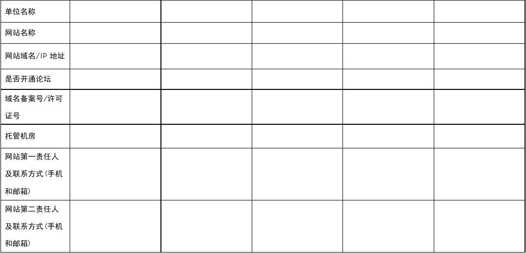 注:若有多個(gè)網(wǎng)站,則分列填寫,有幾個(gè)填幾列,如本表列數(shù)不夠可自行增加列。各列中網(wǎng)站名稱、域名/IP地址、域名備案號(hào)/許可證號(hào)、網(wǎng)站第一、二責(zé)任人按實(shí)際填寫。