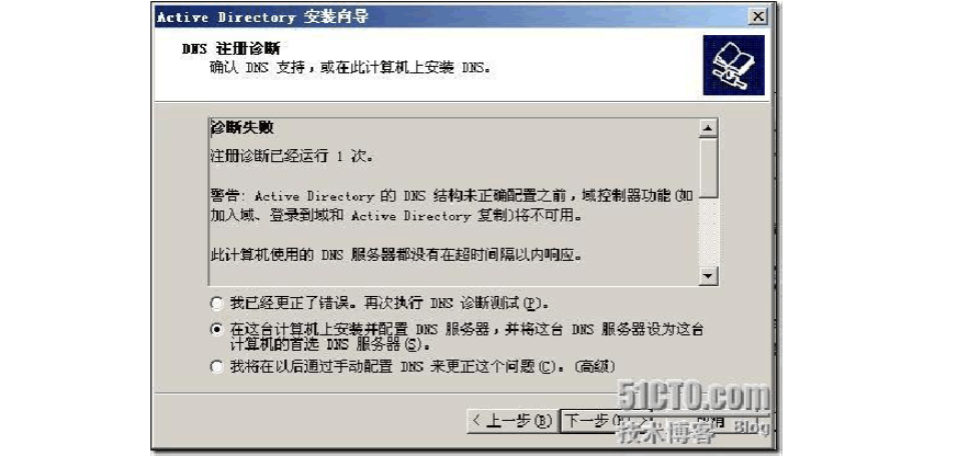 1.2、 安裝活動目錄的過程中,同樣也可以安裝DNS 服務(wù)器,活動目錄的安裝過程就不做過多演示了,安裝過程中出現(xiàn)下面的界面,其中中間的哪項就是安裝活動目錄的過程中也安裝了DNS 服務(wù)器,這樣安裝的DNS 服務(wù)器有域的SRV 記錄,當客戶機加入域的時候就需要這些SRV 記錄進行定位。
