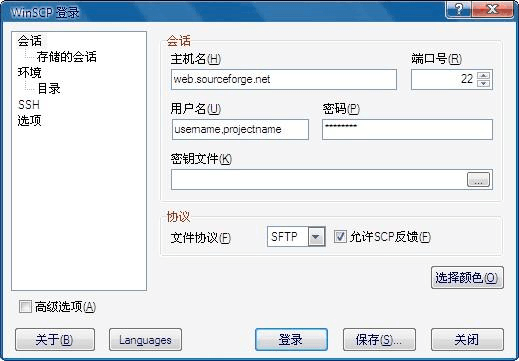 運行程序后點擊左側(cè)的“會話”然后在主機名中輸入web.sourceforge.net 。主機名都填寫這個。端口22