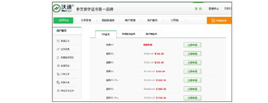 點(diǎn)右上邊橙色“申請(qǐng)證書”連接,選擇您要申請(qǐng)的 SSL 證書,點(diǎn)“立即申請(qǐng)”,如下圖所示
