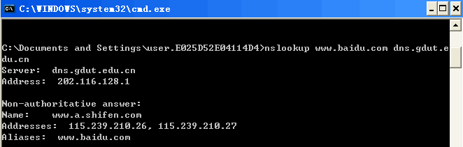 如:nslookup –type=NS gdut.edu.cn(或其它網址,如:中大sysu.edu.cn ,劍橋大學cam.ca.uk ,北大pku.edu.cn ,??)