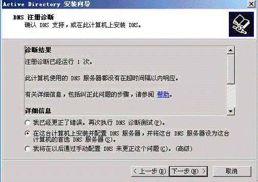 第一次部署時總會出現(xiàn)上面那個DNS 注冊診斷出錯的畫面,主要是因為雖然安裝了DNS ,但由于并沒有配置它,網(wǎng)絡(luò)上還沒有可用的DNS