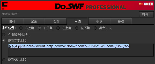 添加水印功能是DoSWF 的重要功能之一。通過(guò)DoSWF ,用戶可以很方便的給SWF 添加文字以及圖片水印。